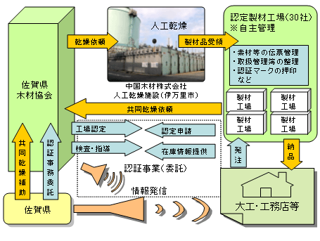 県産人工乾燥木材は、佐賀県木材協会を窓口として県内の製材業者が、民間の乾燥施設を共同利用して生産する人工乾燥木材です。