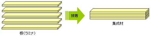 製材された板等を乾燥させ、節や割れ等木材の欠点とされる部分を取り除き、繊維方向を平行にして、接着剤を使って貼り付けた建材です。
