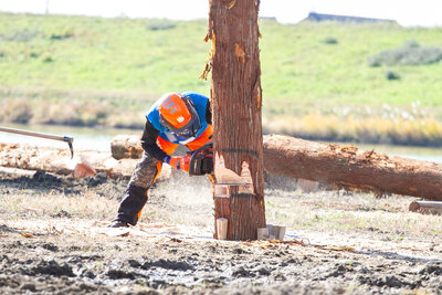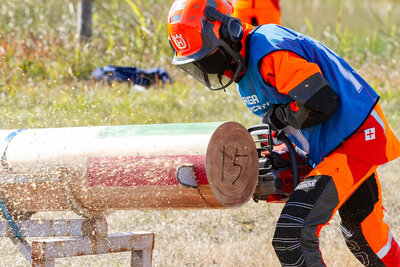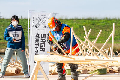 丸太に設置された枝をいかに早く、正確に切断できるかを競います
