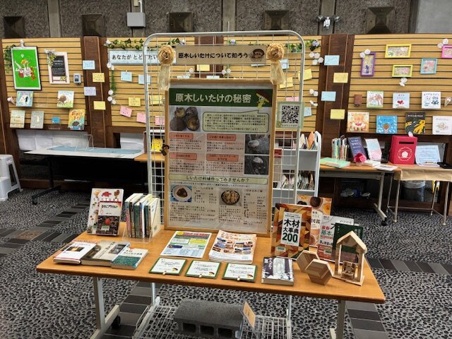 現在、県立図書館1F南口玄関で原木しいたけについての展示を行っています。